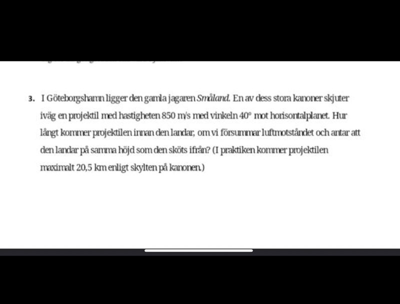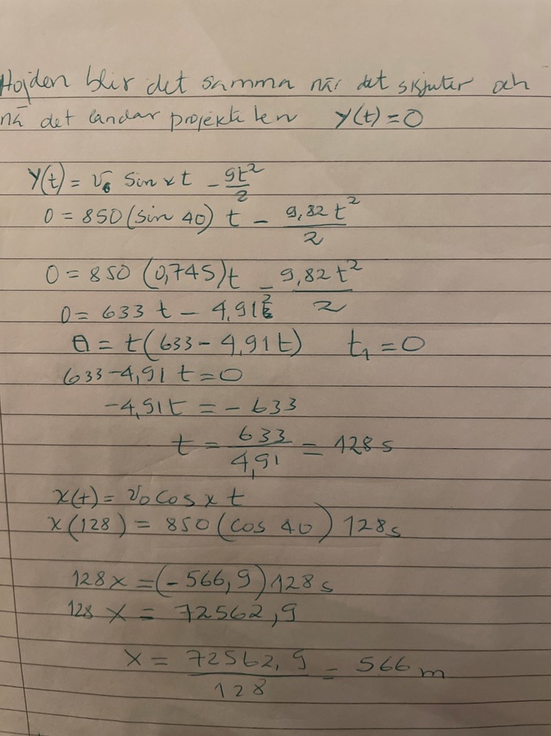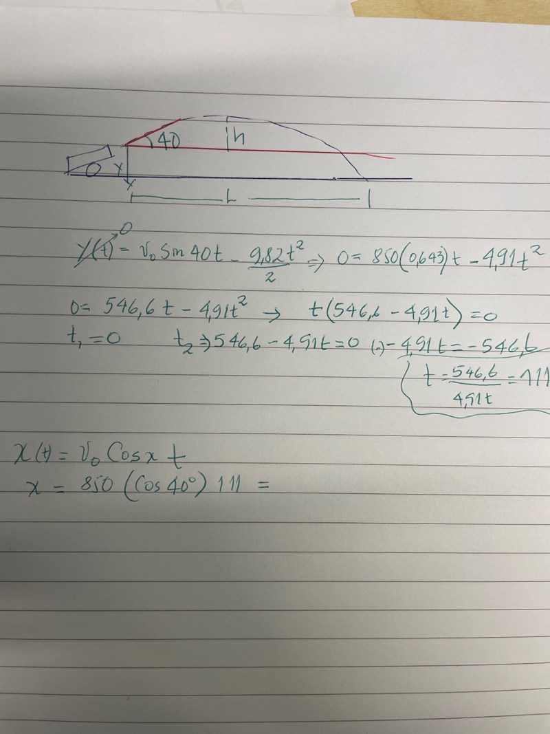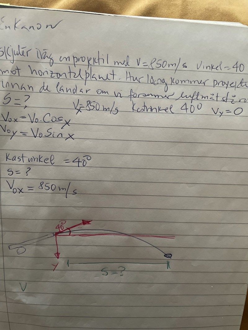 Projektilens hastighet var 850 m/s, komposanten i vertikal riktning är Den komposanten minskar varje sekund med typ 10 m/s, så det tar 55 sekunder att nå högsta punkten. Totalt är projektilen i luften i 110 sekunder.