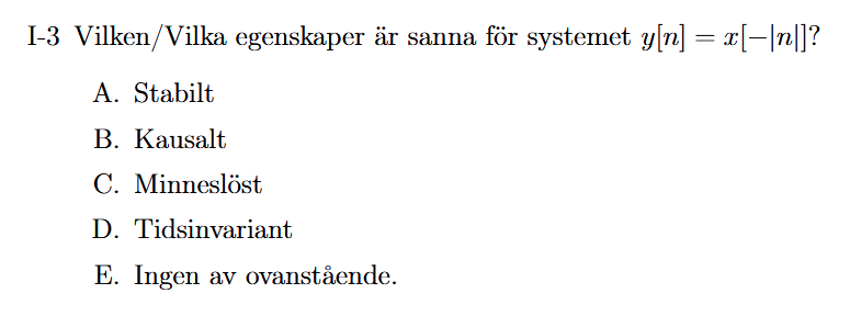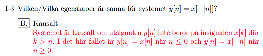 Går igenom en tenta och ska bestämma om y[n] är kausal. Jag vill veta om jag tänker rätt. Vi kan skriva y[n]=x[-n] om n0 och y[n]=x[n] om n<0. Om ett system är kausalt får utsignalen vid någon tidpunkt endast bero på värdena på insignalen fram till och med den tidpunkten. Om vi då exempelvis tar y[10]=x[-10] vilket är ok, och om vi tar y[-10]=x[-10] vilket också är ok. Jag kan inte se hur något värde på n ger ett "framtida" värde på insignalen, vilket hade gjort systemet icke-kausalt. Så systemet måste därför vara kausalt.
