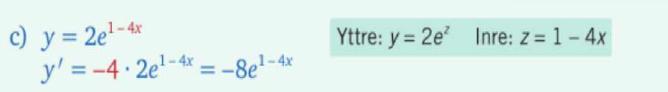 jag brukar bryta ner funktioner som formelsamlingen beskriver sammansatta funktioner, nämligen att om y = f(z) och z = g(x) så gäller för funktionen f(g(x)) att f'(x) = f'(g(x)) * g'(x) men jag förstår inte riktigt hur jag ska tillämpa detta här (eller även kommunicera det skriftligt på prov) skulle verkligen uppskatta en generell formulering (alltså ungefär som formelsamlingens uttryck) där exponenters indelning tydliggörs