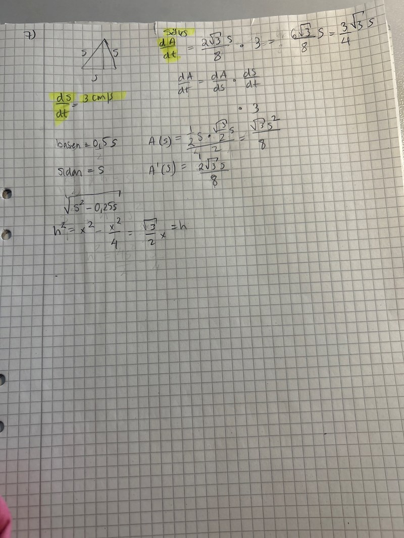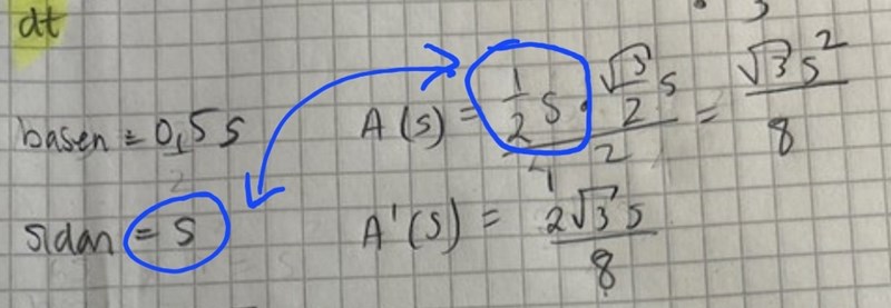 Eftersom så är , men ditt A(s) gäller bara flr halva triangeln (se bild), vilket gär att du fått fel uttryck för