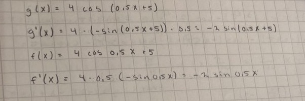 Jag undrar om jag har gjort rätt på uppgiften nedan. Alltså inte bara svar, utan också själva tankesättet/mellanstegen. Jag skulle alltså derivera f(x) resp g(x).