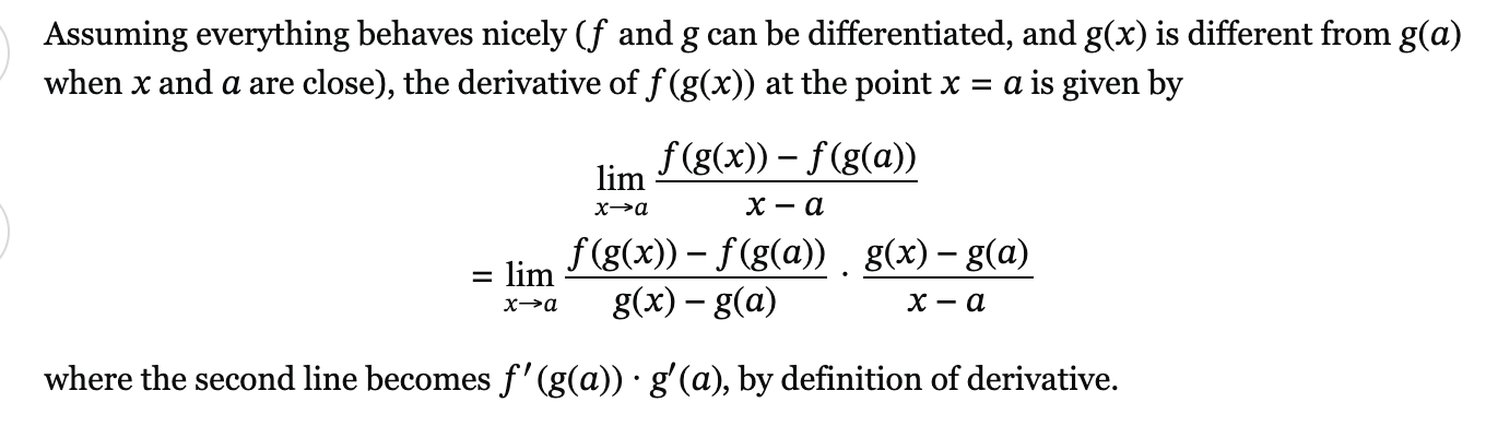 Specifikt i det här fallet förstår jag inte varför man väljer att multiplicera med g(x) - g(a)/x-a. Kan inte se någon logisk anledning att utföra den operationen. Om jag nu inte översätter regeln till någon form av historia där jag kan förhålla mig till det, då är det ganska självklart att man behöver multiplicera med derivatan för den inre funktionen för att få den totala förändringen.