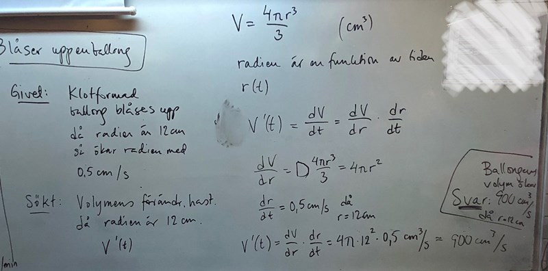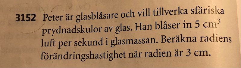 Nej, det där visar hur volymen ändras med tiden. Du ska räkna ut hur radien ändras med tiden. Dvs. .