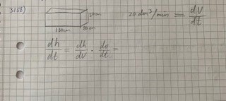 Du kan lösa det med kedjeregeln men det går också att göra det enklare eftersom utflödet är linjärt. Skriv allt som dm så slipper du omvandling till liter. Hur många dm på höjden motsvarar 20 liter?