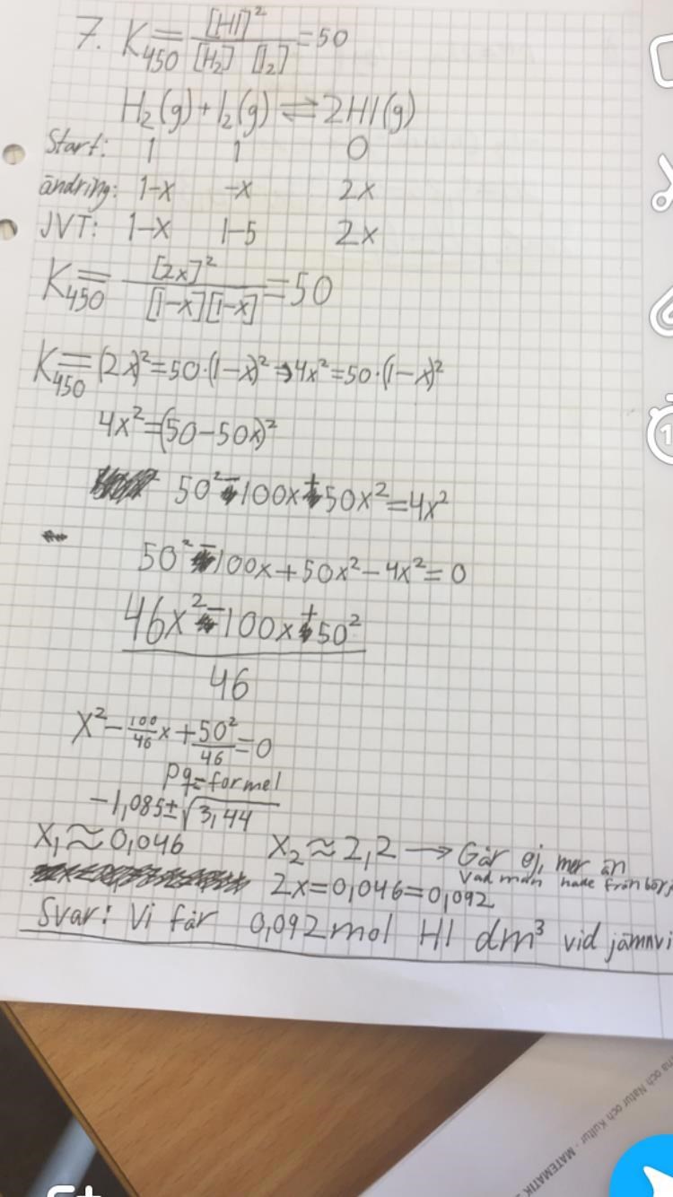 Du har satt in fel startmängd för jodkristallerna. Enligt uppgiftstexten är det 1,1 mol men du räknar med 1 mol. Sen blir det ytterligare fel i ekvationslösningen, men eftersom du kommer att få en ny ekvation att lösa är det inte värt att ändra på det (du kan inte multiplicera in 50 i parentesen på det där sättet). Du behöver också motivera i din lösning varför det går att räkna med substansmängder istället för koncentrationer, d.v.s. varför man kan strunta i volymen.