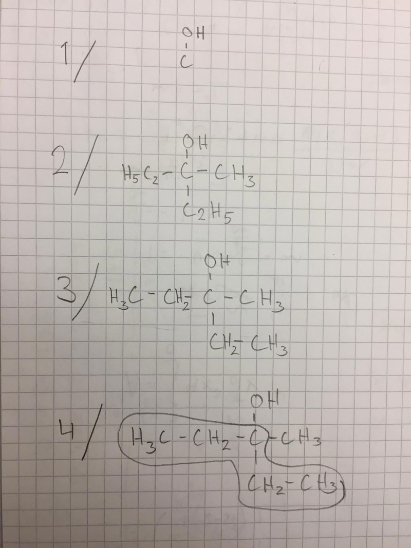 Tack! Nu förstår jag! Så det kol OH sitter på är kopplad till tre olika saker (1.H3C - CH2 ,  2. CH3 och  3. CH2-CH3  därför betyder det att alkoholen är tertiär.
