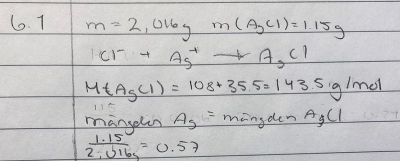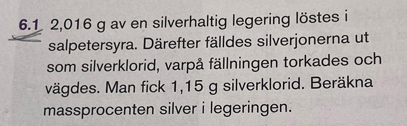 så i 1,15 g AgCl är det 1,15*107,9/(107,9+35,45) gram silver = 0,87 gram