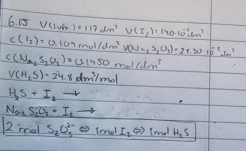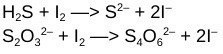 Hur ser dina balanserade reaktionsformler ut? Du behöver en för svavelvätets reaktion med jod och en för jodens reaktion med tiosulfat.