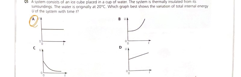 I första frågan är systemet helt isolerat från omgivningen. Systemet består av både iskuben och glaset med vatten. Eftersom systemet är helt isolerat från omgivningen så varken försvinner eller tillkommer någon energi. Därför är den totala energin konstant över tid som graf A) visar.