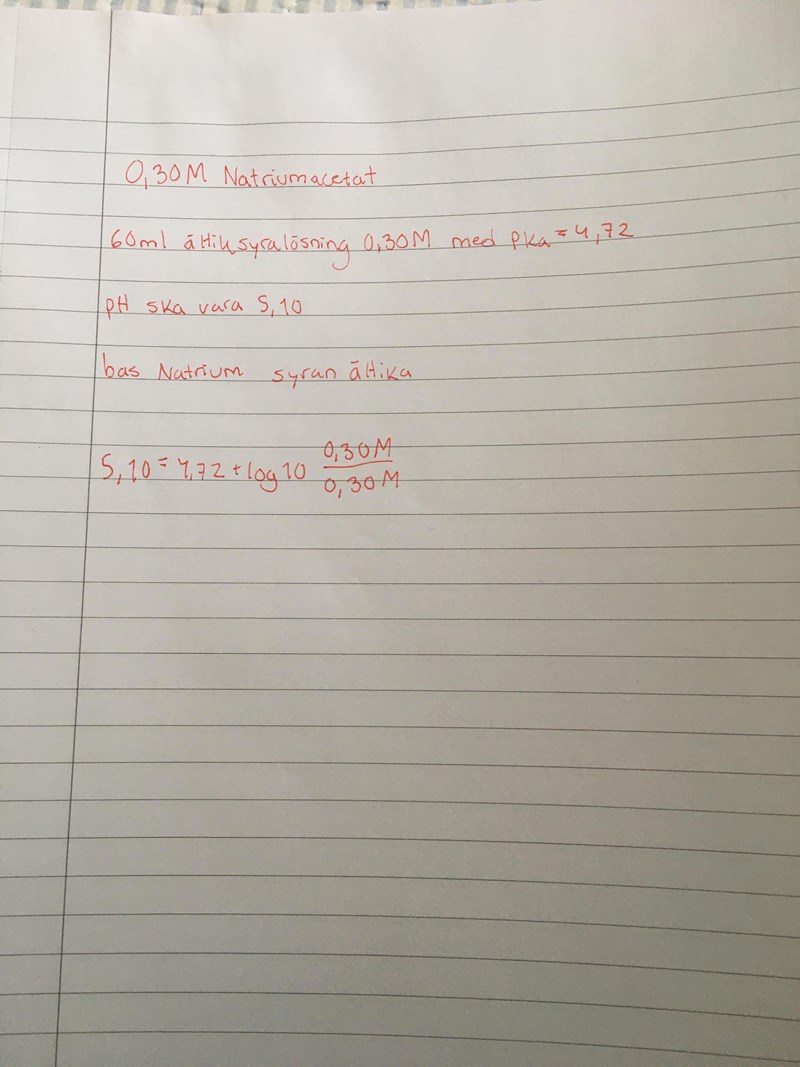 Hur många ml 0,30 M natriumacetatlösning skall sättas till en 60 ml 0,30 M ättiksyralösning för att man skall få en buffert med pH = 5,10? För ättiksyra är pKa = 4,74.