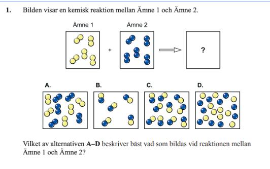 Om det sker en kemisk reaktion bildas bindningar mellan atomerna i ämne 1 och 2. Vid alla kemiska reaktioner bevaras också massan, alltså antalet atomer. Endast i ett av A-D är dessa båda villkor uppfyllda, vilket?
