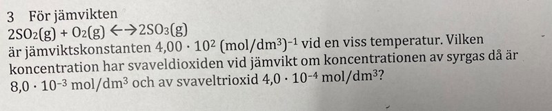 min lösning ser ut så här, men har jag gjort rätt med x? Liksom ska det vara -2x på Svaveldioxid eller ska det vara +2x, samman sak med syrgas är det -x eller +x och med svaveltrioxid, ska det vara +2x eller -2x. Fattar inte riktigt det där :(
