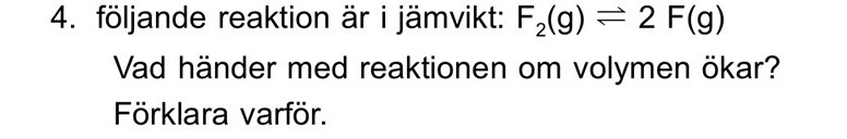Smaragdalena skrev:Kommer koncentrationen/partialtrycket av F2 och F att öka eller minska om volymen ökar (innan den nya jämvikten har hunnit ställa in sig)?
