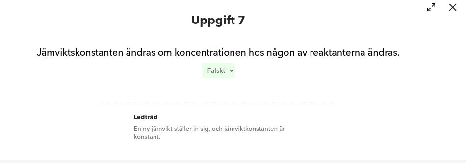 Då är rätt svar "Falskt", därenot kommer jämviktsläget ändras så att koncentrationskvoten åter blir lika med jämviktskonstanten.