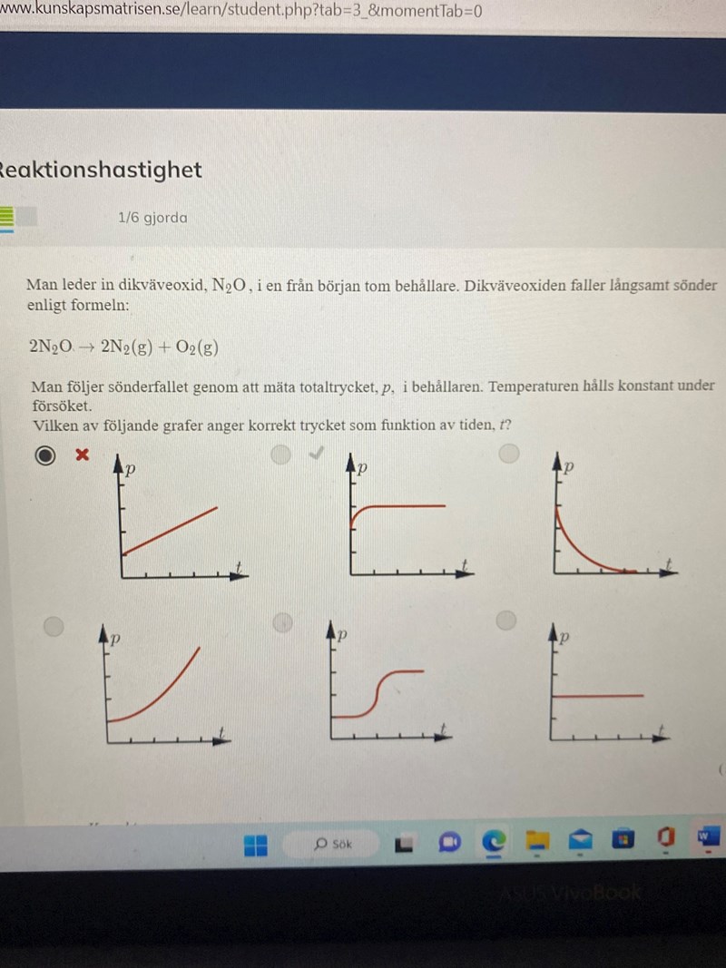 Jag har försökt lösa denna uppgift. Förstår dock inte varför alternativ 2 är svaret på frågan. Jag förstår att det vid sönderfallet behövs tryck eftersom det bildas fler mol gasmolekyler. Är inte tryck och substansmängd proportionella och att förhållandet därmed borde vara linjärt?