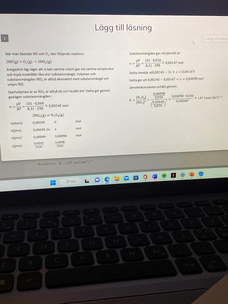 Jag har försökt lösa denna uppgift. Jag har förstått att Kvävemonoxiden och Syret bildar kvävedioxid och att det bildas 0,0045 mol kvävedioxid. När det kommer till reaktionen kvävedioxid till kvävetetraoxid förstår jag inte varför det blir som det blir. Via den avgivna trycket och volymen har jag kunnat beräkna substansmängden till 0,00147 vid jämvikt. Varför är det dock substansmängden kvävedioxid plus kvävetetraoxiden som bildar 0,00147 mol? (0,0045-2x+x=0,00147) Det är den biten jag inte förstår.