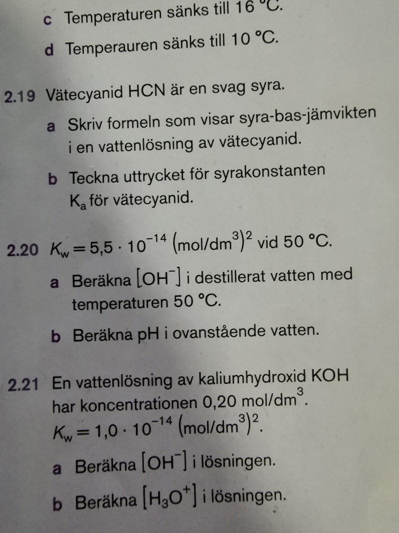 För att lösa uppgift a) måste du först konstatera att kaliumhydroxid är en stark bas (egentligen: ett basiskt salt som delas upp fullständigt i kaliumjoner och hydroxidjoner när det löses i vatten) och att [OH-] kommer att vara 0,20 mol/dm3 i lösningen. Utifrån det kan du bestämma lösningens pOH-värde och sedan dess pH-värde då pOH+pH=14.