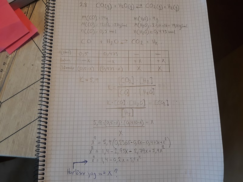 Har precis börjat med kemisk jämvikt och förstår inte ur jag ska kunna lösa ut x i denna beräkning?