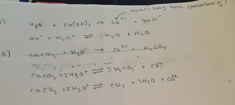 och i b, menar du att det först bildas kolsyra? eller det går ju inte. Är kalciumjonerna starkare bas än kolsyra? Det låter inte rimligt.