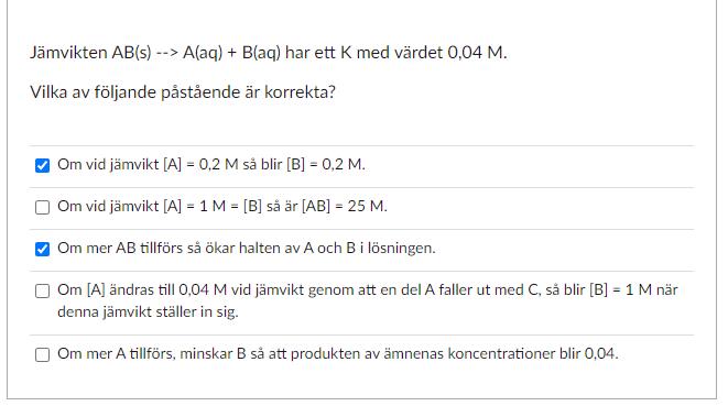Om [A] minskar så kommer mer AB att lösa upp sig. Då ökar både [A] och [B] tills produkten av deras koncentrationer blir 0,04, under förutsättning att det finns tillräckligt mycket AB. Påståendet är alltså inte korrekt.