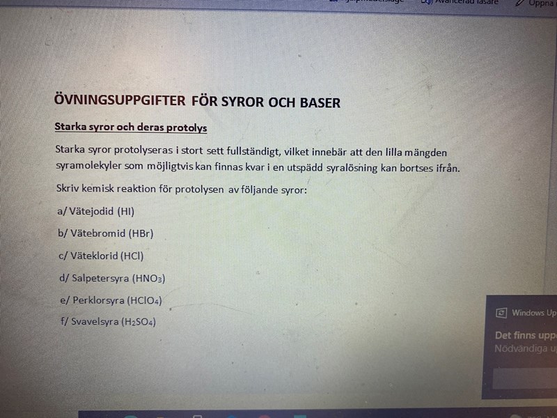 En syra är ett ämne som kan avge en vätejon (eller flera). På gymnasiet handlar syrabasreaktioner alltid om att syran (eller basen) löses upp i vatten. När man löser upp en syra i vatten så bildas det alltid en oxoniumjon H3O+. När vätejodid (HI) reagerar med vatten så sker reaktionen HI + H2O <=> H3O+ + I-. Kan du försöka skriva de andra reaktionsformlerna?