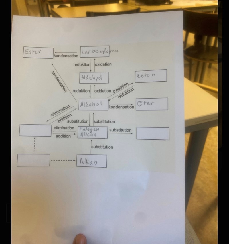 Vilken typ av reaktion(er) leder till/från denna ruta? Kanske kan det hjälpa att rita upp strukturformeln för ett av de andra ämnena (som kan modifieras till det okända ämnet i rutan).