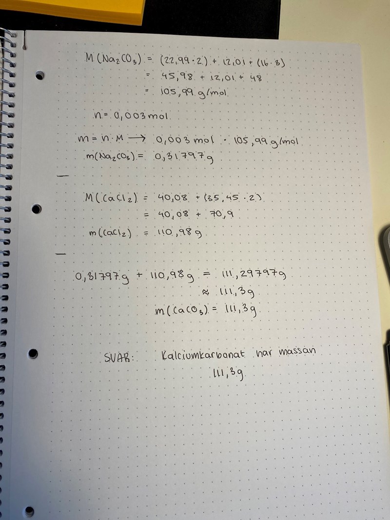 Vilken massa har 0,003 mol kalciumkarbonat?