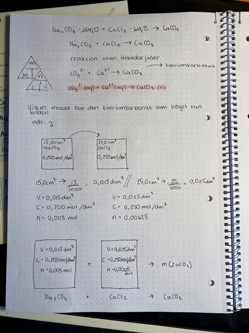 När jag kollar på min ”förenklade” reaktionsformel CO^3^^2-+Ca^^2–>CaCo^3 så ser jag att ration mellan alla de olika ämnena är 1:1:1. Så med det försöker jag att tänka att om CO^3^^2- är den begränsande eftersom att den bara är 0,003mol så borde det ju endast gå att göra så mycket kalciumkarbonat för att sen kan man ju inte bilda lika mycket. Men vad ger det mig för svar då?