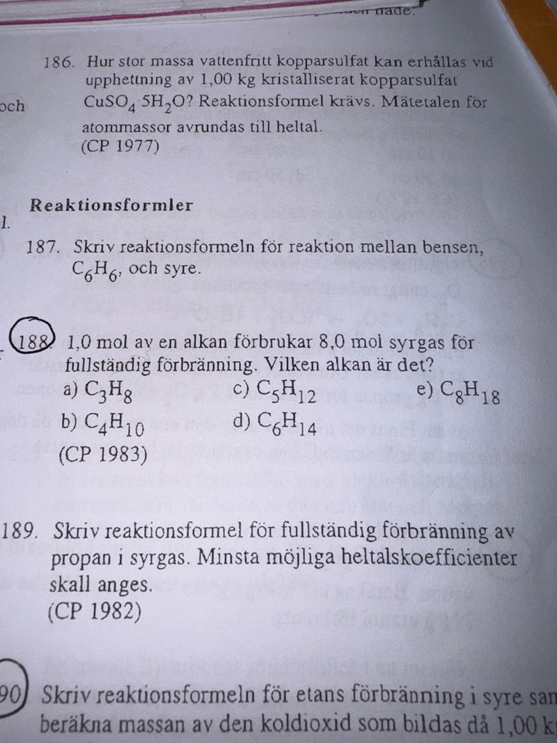 Hej, behöver hjälp med hur jag ska börja för att lösa uppgift 188, jag vet hur man använder formeln M*n=m , som vi använder för att få Massan/substansmängd och jag vet hur man får fram mol massan, men jag kan inte riktigt förstå hur man ska räkna denna uppgift