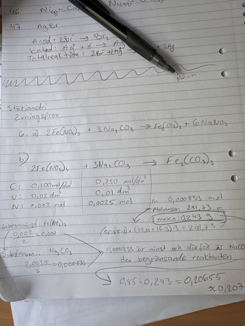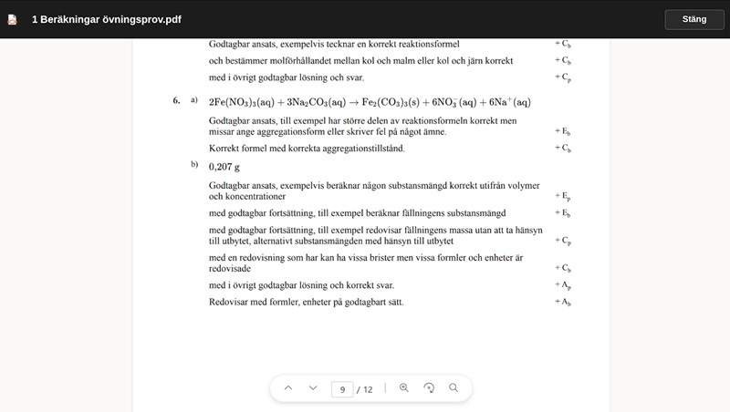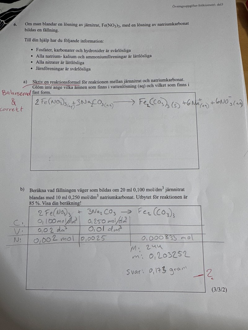 Vad gäller 6a) hade jag snarare skrivit 6 NaNO3 (aq). Men! Jag är skeptisk till att det bildas Fe2(CO3)3, alltså järn(III)karbonat. Den lär inte vara stabil i vattenlösning och falla ut. Föreningen finns förvisso och kan bildas under hög temperatur och jättehögt tryck. Får du en fällning så är det säkerligen något annat, kanske en hydroxid. (Om facit håller med dig, så får jag böja mig, men är ändå inte övertygad.)