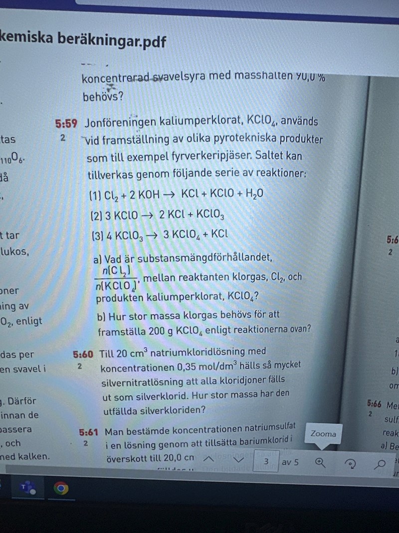 på A tänker jag att jag delar 1 med 3 eftersom alla dessa tre reaktioner börjar med 1 mol cl2 som senare i slutet bildar 3 mol KCIO4.