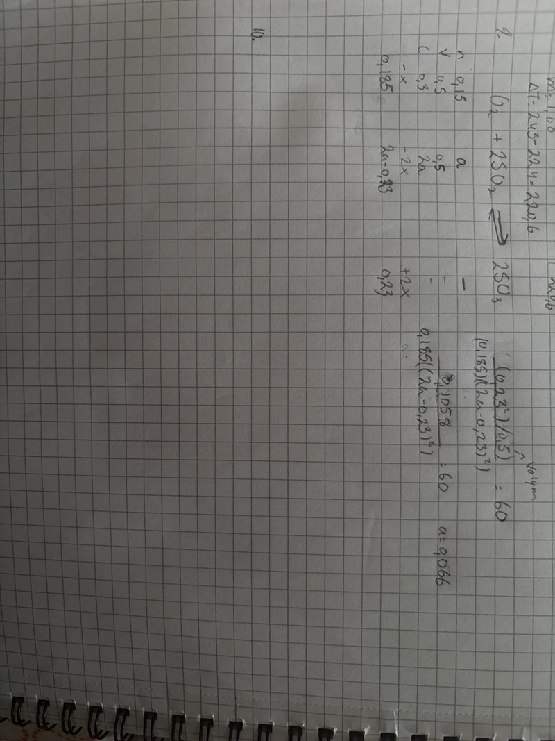 En sluten behållare innehåller 0,15 mol syrgas och en okänd mängd svaveldioxid. behållarens volym är 0,5 dm. vid jämvikt har det bildats 0,23 mol svaveltrioxid. Hur stor mängd svaveldioxid fanns det från vörjan om jämviktskonstanten är 60 M^-1. Temperaturen hålls konstant under försöket.
