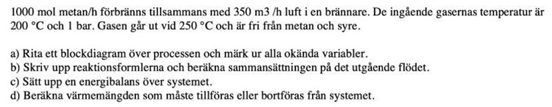 En uppgift vi gick igenom var "beräkna den värmemängd som avges då förbränningen av metan sker vid 200 grader".