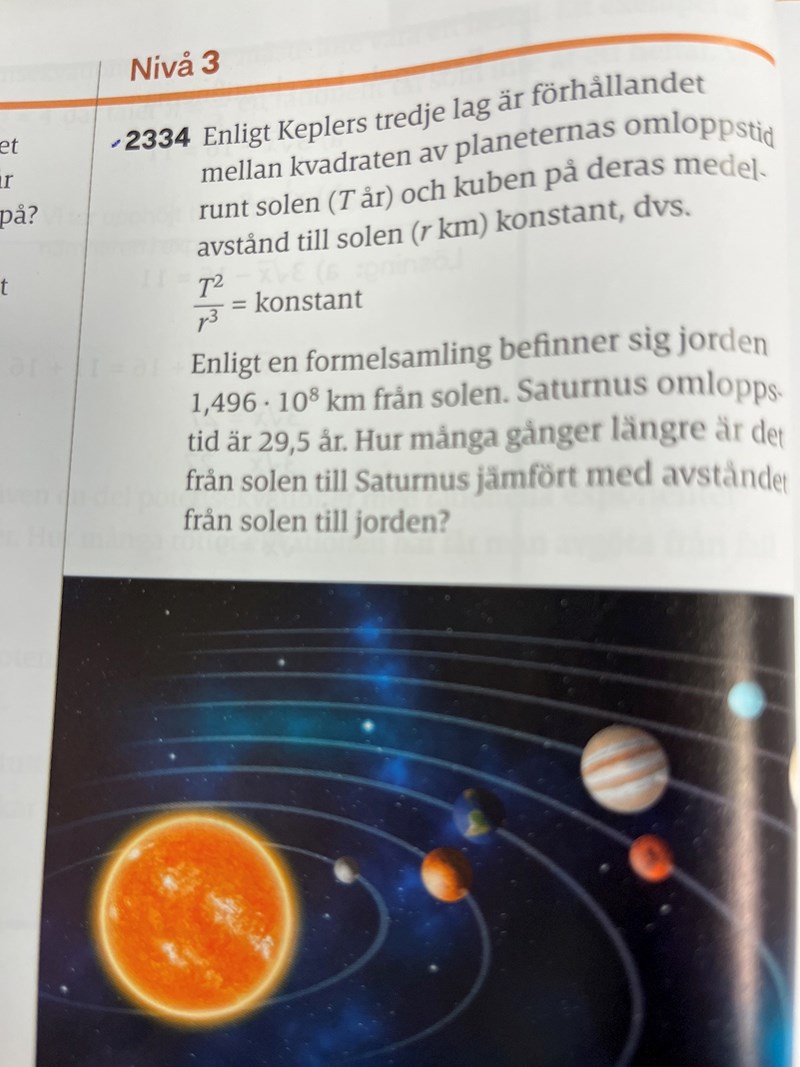 Du vill ju beräkna hur många gånger längre avståndet mellan solen och Saturnus jämfört med mellan solen och Jorden, så sätt avståndet mellan solen och Jorden till x och avståndet mellan solen och Saturnus till ax. Sätt in värdena på T och r i uttrycket och beräkna värdet på a.