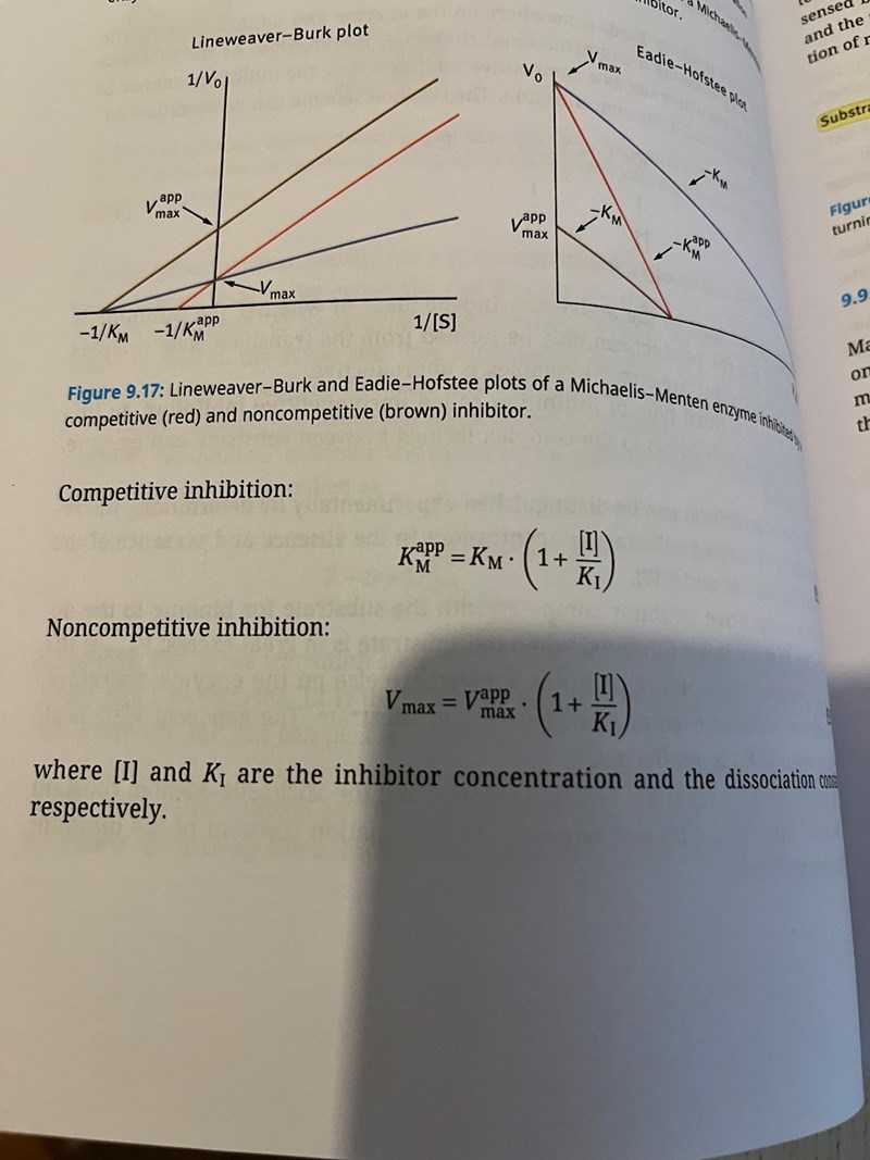 Beroende på vilken typ av inhibition som sker (kompetitiv eller icke-kompetitiv) så kommer graferna att ändras på olika vis, när de jämförs med enzymet utan inhibitor. Detta är i princip vad som ses i bilden.
