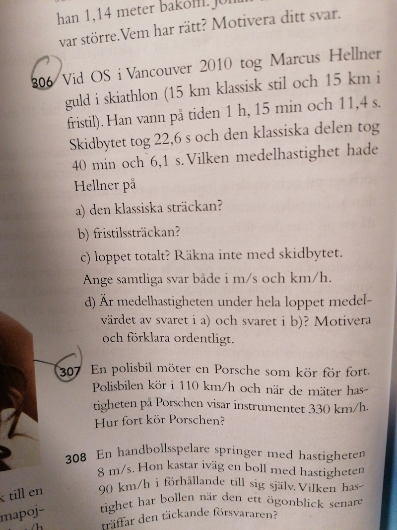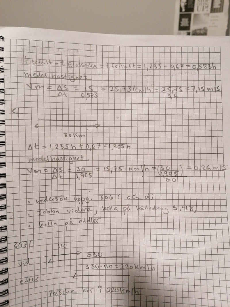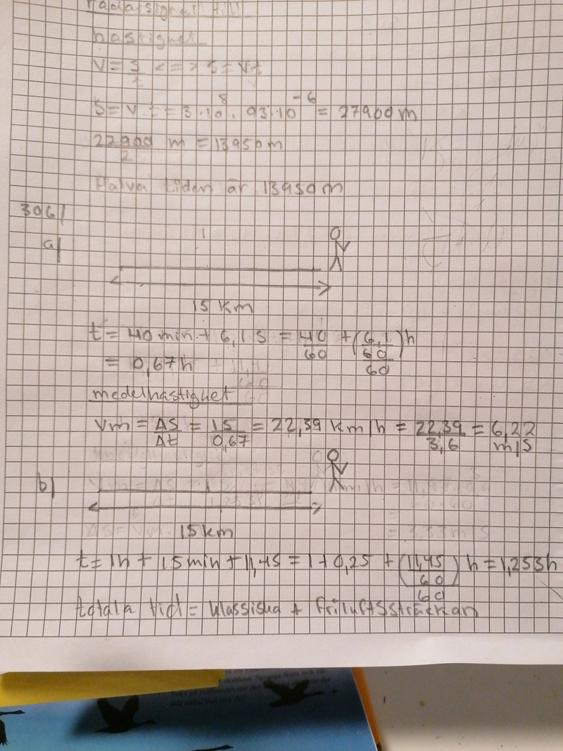 Hej. Jag förstår vad medelhastighet är, men lite osäker på vad jag ska göra på 306 c). Ska jag se delta som addition av två sträckor och additiom av två tid? Detta ger mig 15.76km/h eller 0.26m/s. Inget av de värden stämmer. Alltså vad säger ni??