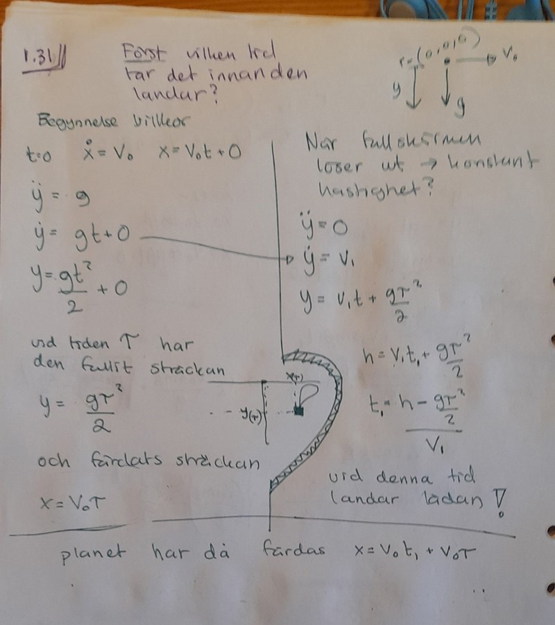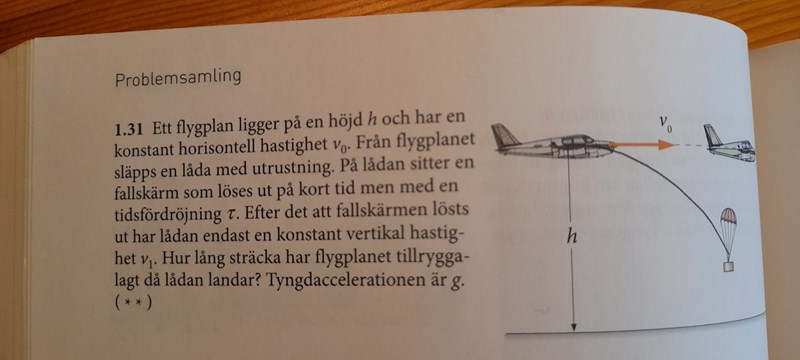 PATENTERAMERA skrev:Under tiden tau faller lådan sträckan s = g(tau)2/2. Sedan måste lådan falla den ytterligare sträckan h - s för att nå marken. Tiden t1 det tar att falla sträckan h - s med hasigheten v1 är (h - s)/v1. Den total tiden för lådan att nå marken är således tau + t1 och på den tiden hinner planet sträckan v0(tau + t1).