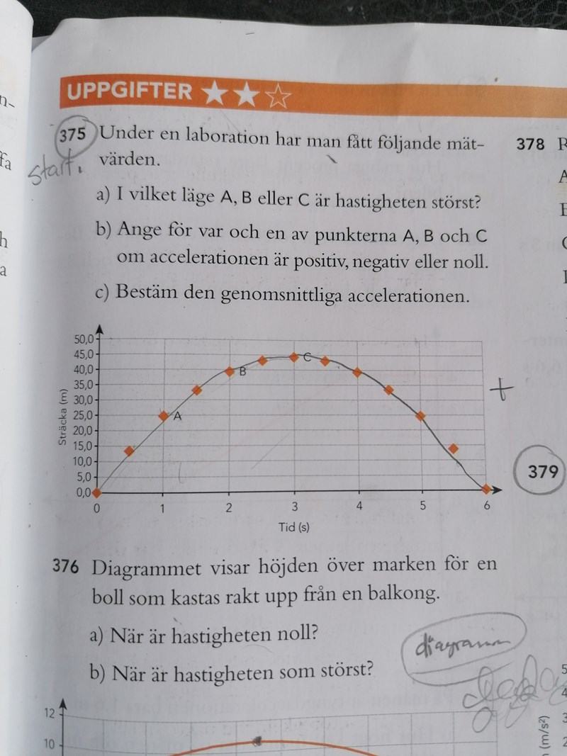 På b) hade jag tänkt att den som ser ut att ha positiv lutning ger en positiv hastighet, och därefter gissades att acc. Också var positiv eller noll. Fast nu känns som att man borde kolla åt sidorna än just en punkt ex.