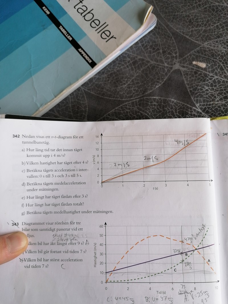 På uppgift 342 d, f och g går det att ange lite bättre värden. T.ex accelerationen 2 på c delen) ska vara 9m/s^2, hela sträckan på f delen) ska vara 29m och hela medelhastighet ska vara 5.8m/s.
