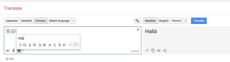 Det funkar jättebra med google translate. Du skriver fonetisk och du kan byta ut teckerna med space. Google är rätt bra för att föreslå korrekt tecken (rätt ''ma'' nu), men blir det fel får du välja själv!