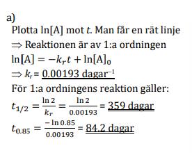 Är du med på att lösningen för t½ skulle kunna ha skrivits som -ln(0,5)/kr? Då är det enklare att se hur den lösningen hänger ihop med den för 85 %.