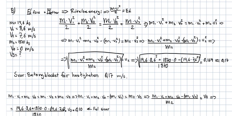 från blocket.Vilken hastighet får betongblocket efter kollisionen om betongblockets massa är 1870 kg?