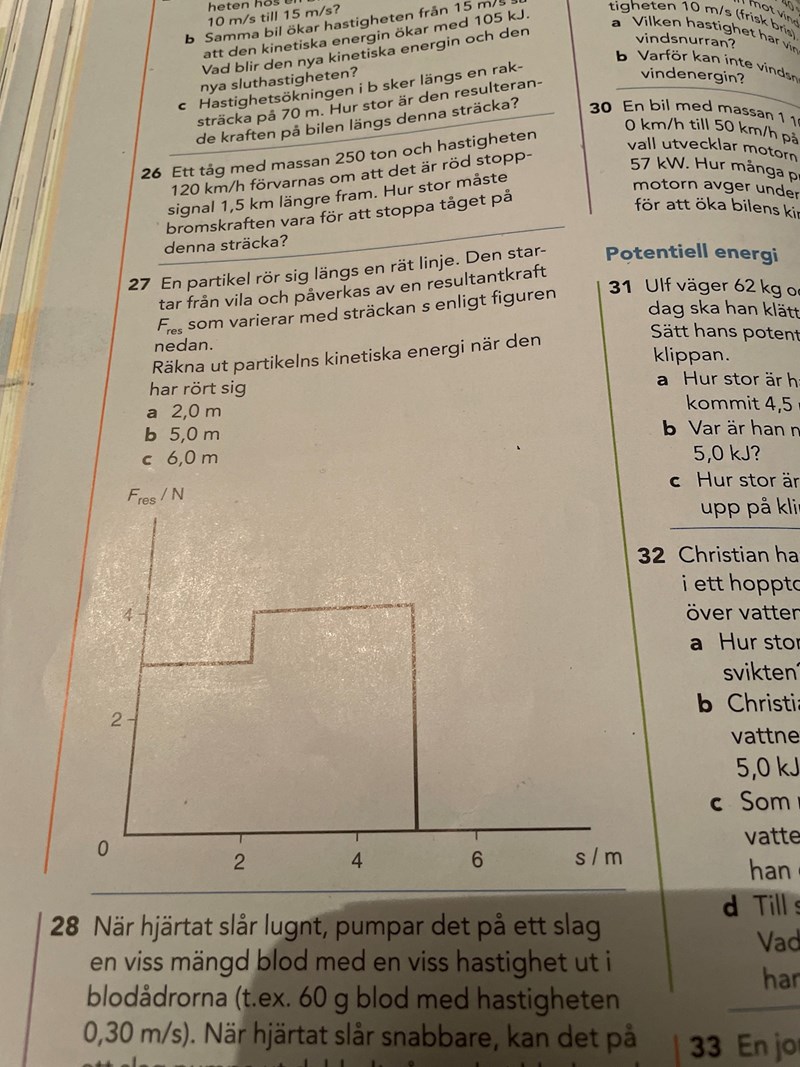 - partikeln påverkas av kraften 0 N under en sträcka som är 1 meter lång (färden mellan 5 m och 6 m).