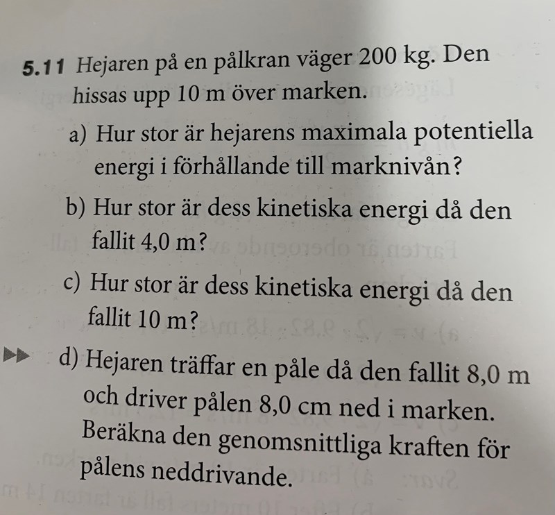 Du räknade ut den kinetiska energin i c), den kommer att omvandlas till värme när pålen flyttar sig 8 cm.
