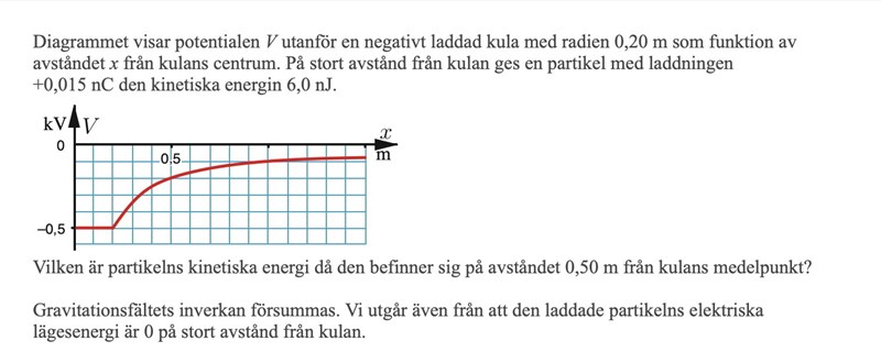Det klurig här är att lägesenergin är 0 långt från kulan och följaktligen ännu lägre (alltså negativ) ju närmare kulan partikeln kommer.