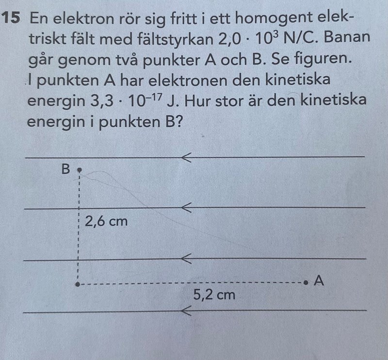 Undrar hur man ska tänka i denna uppgift? Jag använde sträckan som den färdades i x led, längst med det elektriska fältet, för att hitta den kinetiska energin. Dock har jag inte tagit hänsyn till att den redan hade energi men om jag adderar dessa två värden blir svaret ännu längre ifrån facit som sade 1,6*10^(-17) J. Elektronen får ju högre energi då den ökar hastighet men påverkar både en förflyttning i x-led och y-led denna ökning eller endast x-led eftersom den då färdas med fältet och accelererar?