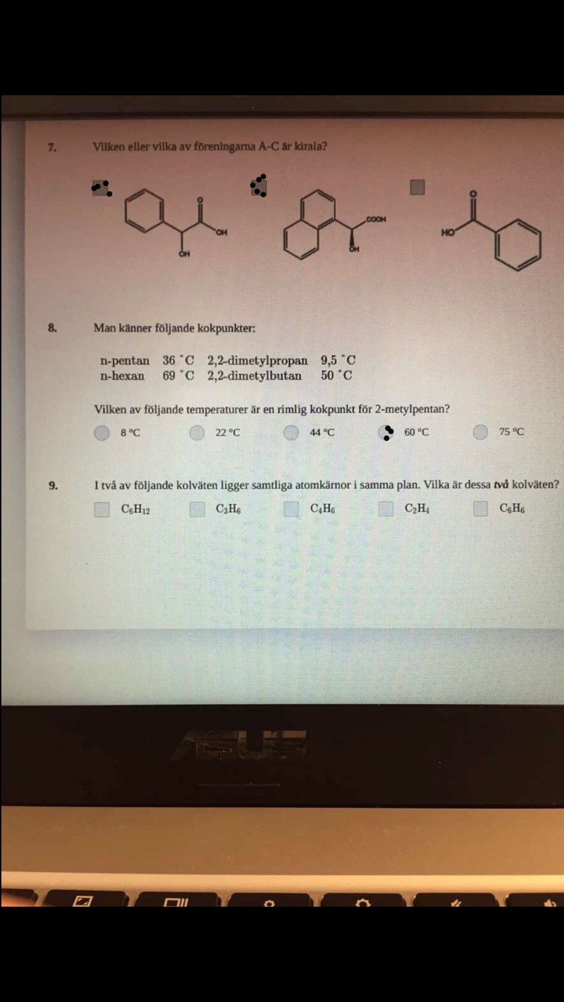 7 är den som är i mitten och den sista åt höger alltså bensoesyra för att den skiljer sig från sin spegelbild men jag vet ej om jag har rätt eller ej. 9 vet jag ingenting om. Behöver hjälp