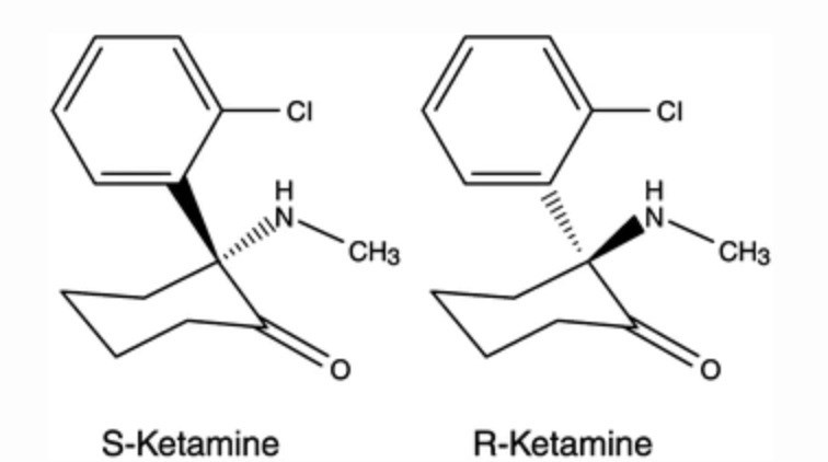 När du betraktar S- och R-formerna kring den kirala kolatomen, syns att S/R formerna är asymmetriska - och därför är ketamin en kiral förening.