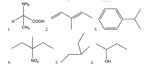 Det finns en kolatom i nr 6 som binder till 4 olika grupper (tänk på att väten är "osynliga" i skelettformler).