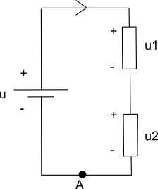 Om du börjar i punkten A i figuren nedan sedan går moturs (mot strömmen) och summerar spänningarna får du: u2 + u1 - u = 0